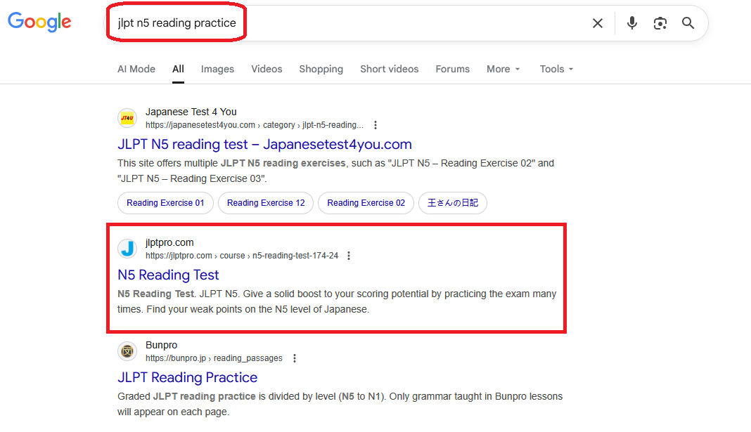 Step 1: Open google.com and search for keyword: jlpt n5 reading practice
