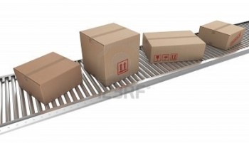A. He’s filling the boxes with shoes B. The boxes are on the belt C. The boxes are being stacked on the floor D. The warehouse is full of people